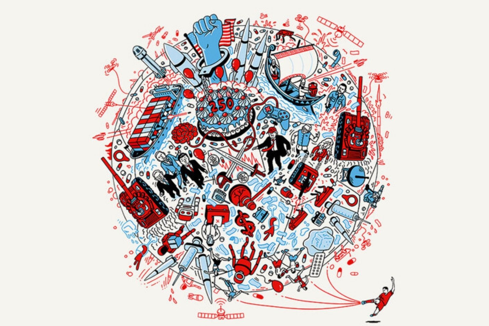 Yanında 250 yazılı bir pasta: ABD’nin 250. bağımsızlık yıldönümü (2026 tam o yıl), ama balonlu kutlama havası ironik.