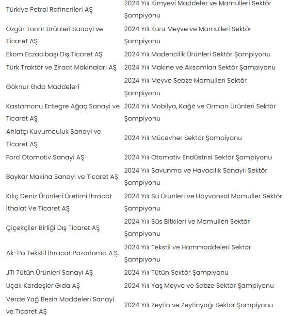 2024'te en çok mal ihracatı gerçekleştiren ilk 10 şirket ise "Ford Otomotiv, Toyota Otomotiv Sanayi Türkiye AŞ, Türkiye Petrol Rafinerileri AŞ, Kibar Dış Ticaret AŞ, Star Rafineri, TGS Dış Ticaret AŞ, Oyak-Renault Otomobil Fabrikaları, Vestel, Arçelik ve Baykar Makina" oldu.