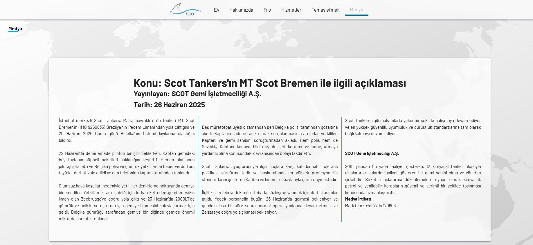 “istanbul merkezli Scot Tankers’a ait Malta bandıralı ürün tankeri MT Scot Bremen (IMO 9260835), Brezilya'nın Pecem Limanı'ndan yola çıkmasının ardından 20 Haziran 2025 Cuma günü Belçika'nın Ostend kenti açıklarına varmıştır.