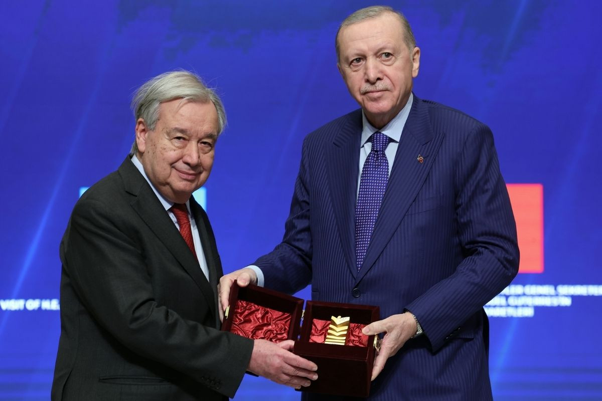 Cumhurbaşkanı Erdoğan konuşmasının ardından Birleşmiş Milletler Genel Sekreteri Antonio Guterres'e Atatürk Uluslararası Barış Ödülü'nü takdim etti.