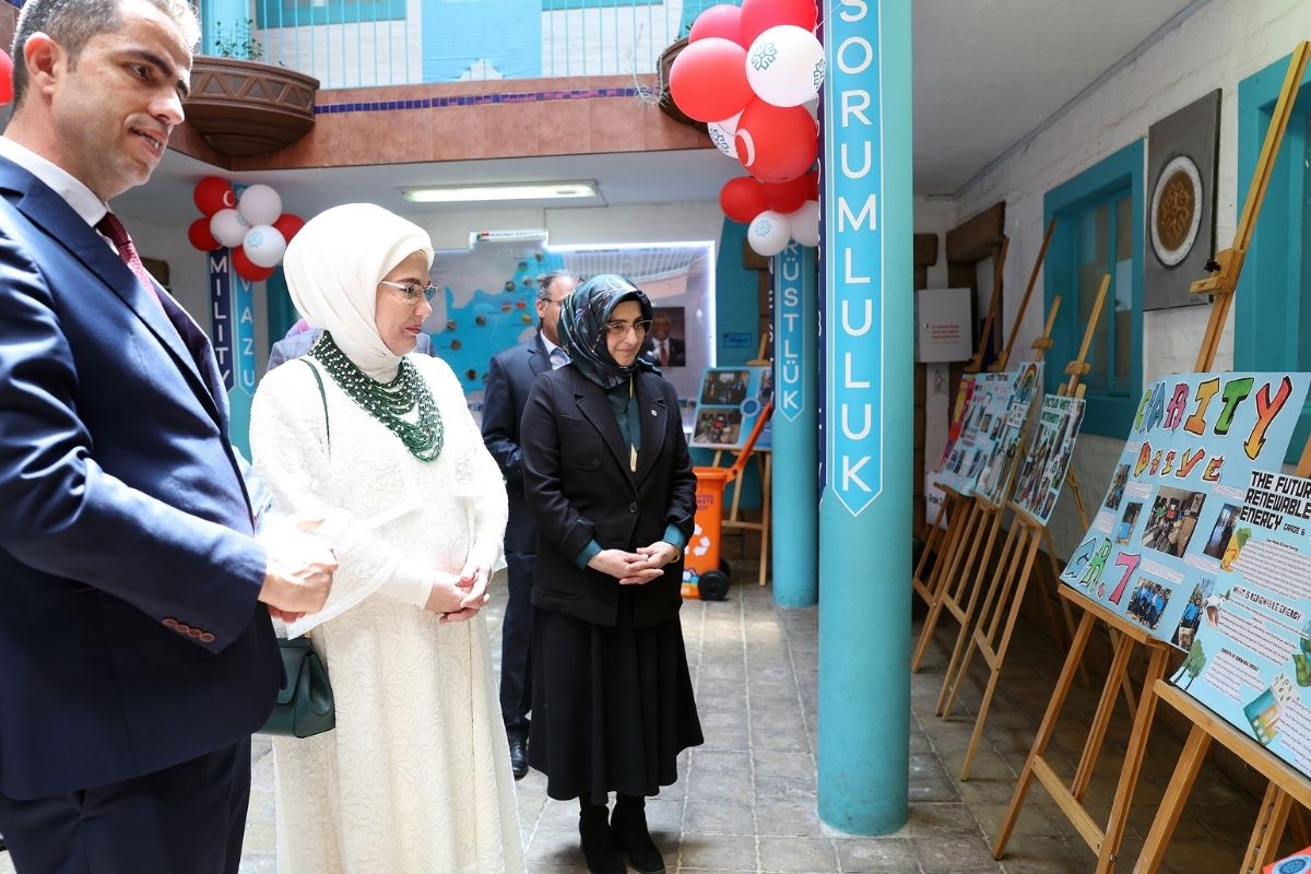 "Geri Dönüşüm ve Çevre" temalı sergiyi gezen Emine Erdoğan, buradaki çalışmalar hakkında öğrenci ve öğretmenlerden bilgi aldı.