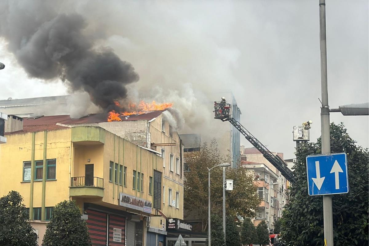 Binadaki çalışanları tahliye eden itfaiye ekiplerinin yangına müdahalesi sürüyor.