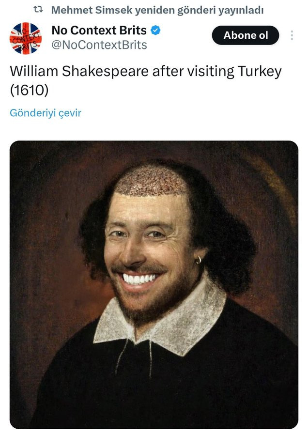 Şimşek geçtiğimiz günlerde de mizahi içerikleriyle bilinen No Context Brits adlı hesabın “Türkiye'yi ziyaret ettikten sonra William Shakespeare (1610)” notuyla yayınladığı görseli yeniden paylaşmıştı.