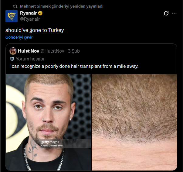 Hazine ve Maliye Bakanı Şimşek, havayolu şirketi Ryanair’in, dünyaca ünlü şarkıcı Justin Bieber’ın saç yapısını eleştiren bir gönderisini yeniden paylaştı.