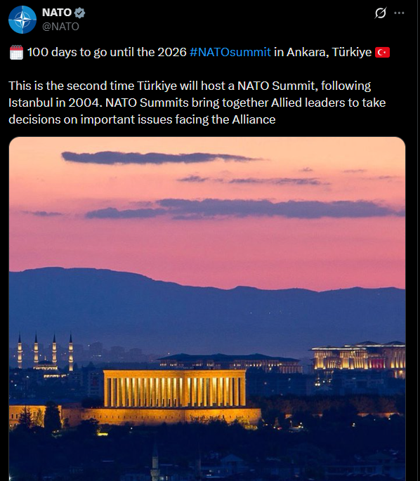 NATO'nun sosyal medya hesabından yapılan paylaşımda, Türkiye'nin kurucusu Mustafa Kemal Atatürk'ün ebedi istirahatgahı Anıtkabir'in bir fotoğrafı ile "Türkiye'nin başkenti Ankara'da düzenlenecek 2026 NATO Zirvesi'ne 100 gün kaldı" ifadesi kullanıldı.