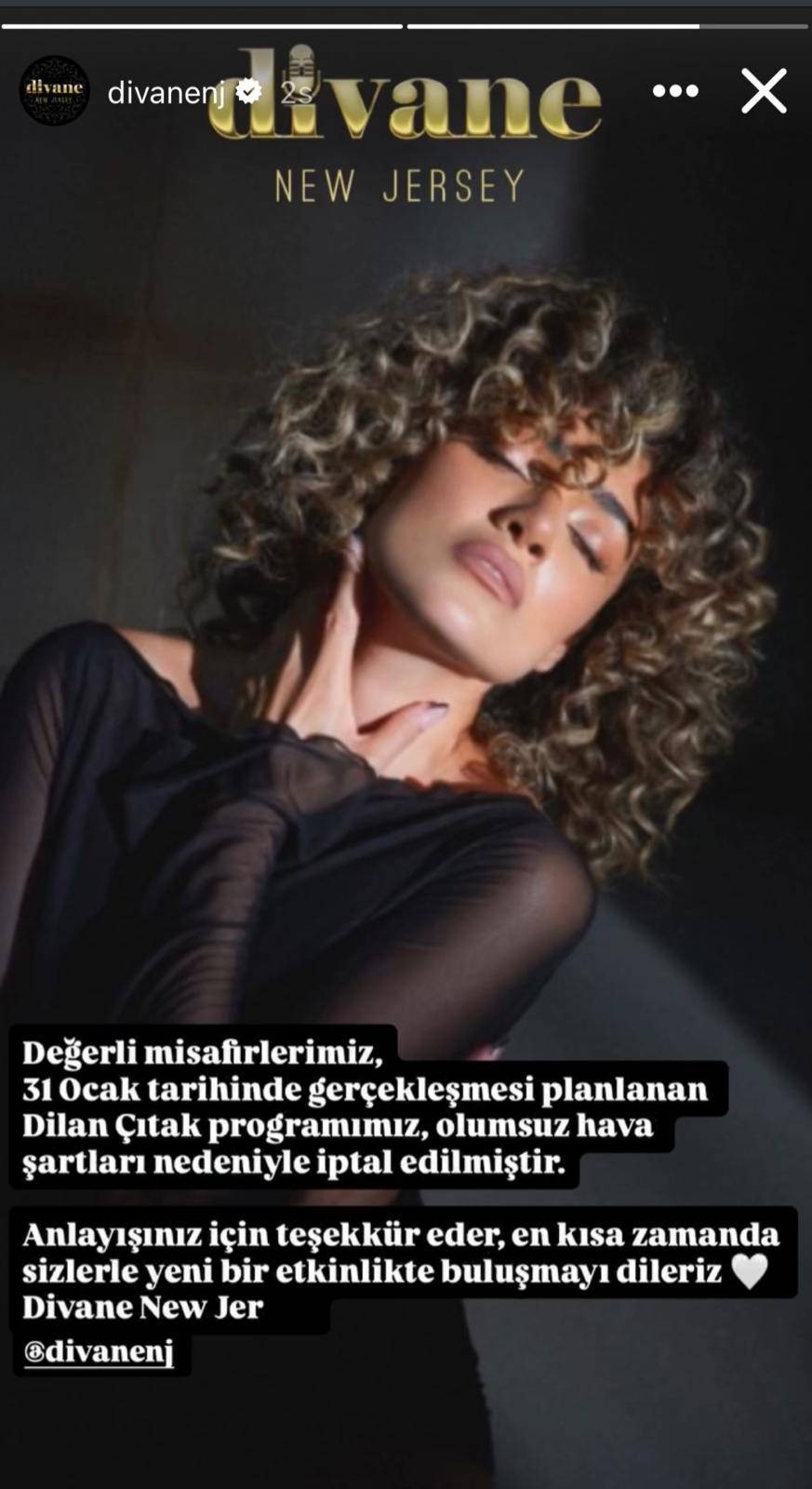 İbrahim Tatlıses'in kızı Dilan Çıtak’ın 31 Ocak gecesi Divane New Jersey sahnesinde müzikseverlerle buluşması planlanan konseri, olumsuz hava koşulları nedeniyle iptal edildi.