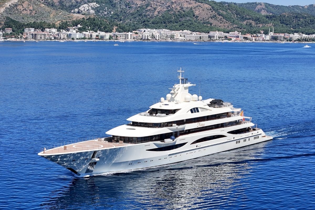 Hintli çelik sektörünün önde gelen iş insanlarından Lakshmi Mittal'a ait olduğu belirtilen yat, ikmalin ardından ilçeden ayrılarak Yunanistan'ın Atina kentine doğru yola çıktı.
