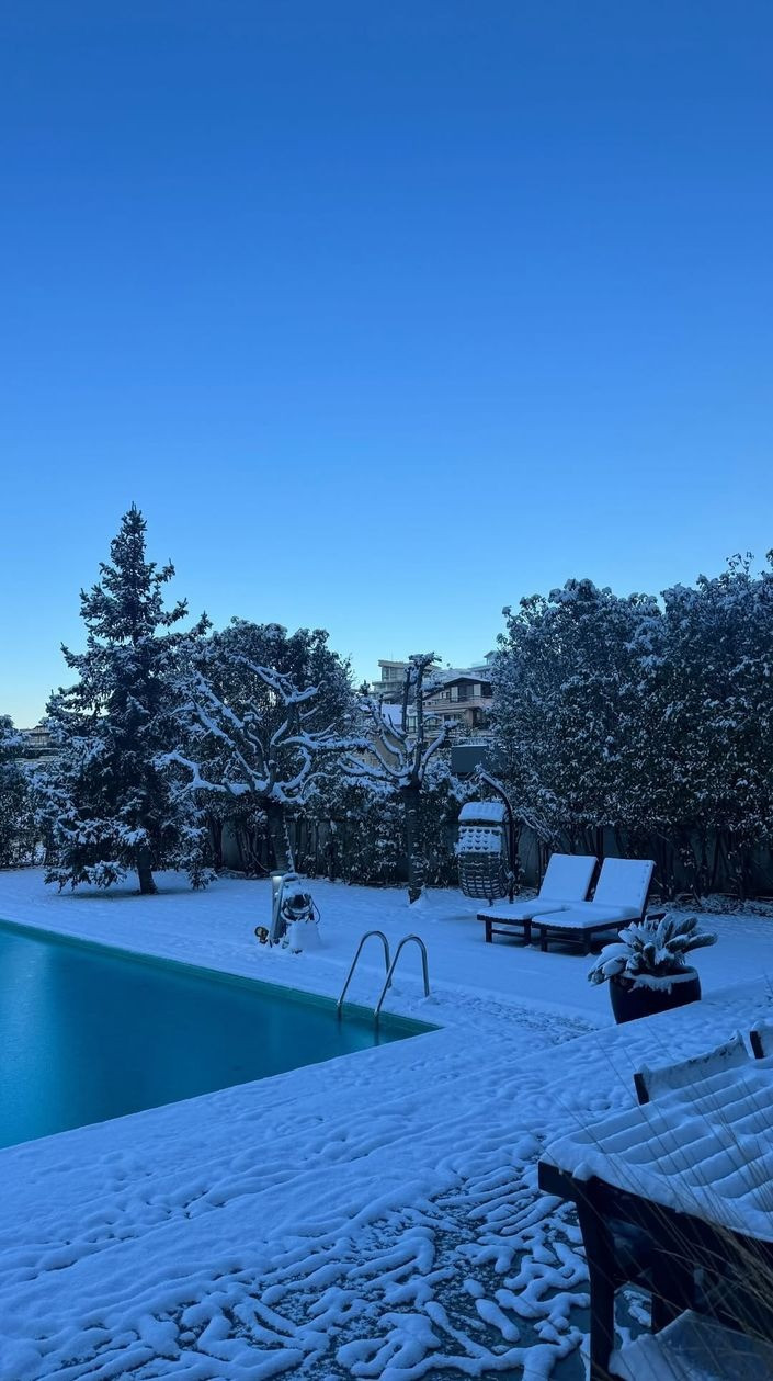 Yasemin Ergene de evinin bahçesini çekti. Havuzu buz tutan Ergene, karın keyfini çıkardı.
