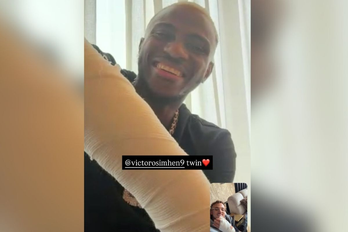 Kolu alçıya alınan Victor Osimhen ile parmağından ameliyat olan Noa Lang, görüntülü görüşerek birbirlerine destek oldu. Görüşme anına ilişkin fotoğrafı ise Lang sosyal medya hesabından paylaştı.