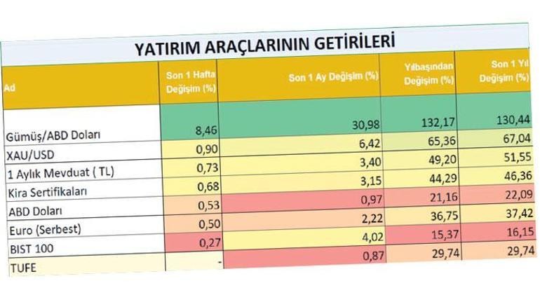 Haftaya yatırım araçları cephesinde gümüşün açık ara öne çıktığı bir tabloyla girildi. Gümüşün onsu, haftalık bazda yüzde 8.46 yükselişle en güçlü performansı sergilerken, aylık artış yüzde 30.98, yılbaşından bu yana da yüzde 132.17 seviyesine ulaştı. Altın tarafında yükseliş daha sınırlı kaldı. Ons altın haftayı yüzde 0.90 artışla tamamladı. Yıllık getirisi ise yüzde 67 civarında seyretti. TL mevduat ve kira sertifikalarında haftalık kazançlar yüzde 0.40 bandında kalırken, dövizde sınırlı yükseliş gözlendi. BIST 100 Endeksi ise haftayı yüzde 0.27 artışla 11 bin 341 puandan kapattı. TÜFE’nin aylık yüzde 0.87 gerçekleşmesi, sabit getirili araçlarda reel kazancın sürmesini sağlıyor.