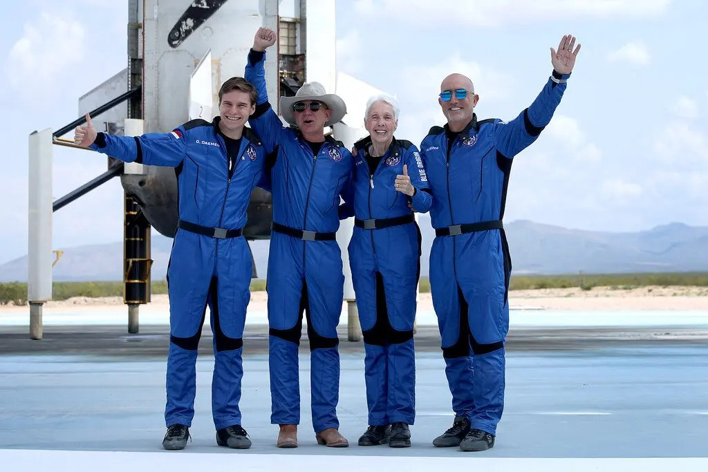 Soldan ikinci sıradaki Jeff Bezos ve ekibi, 2021'de orijinal Blue origin uçuş kıyafetlerini giyiyor.