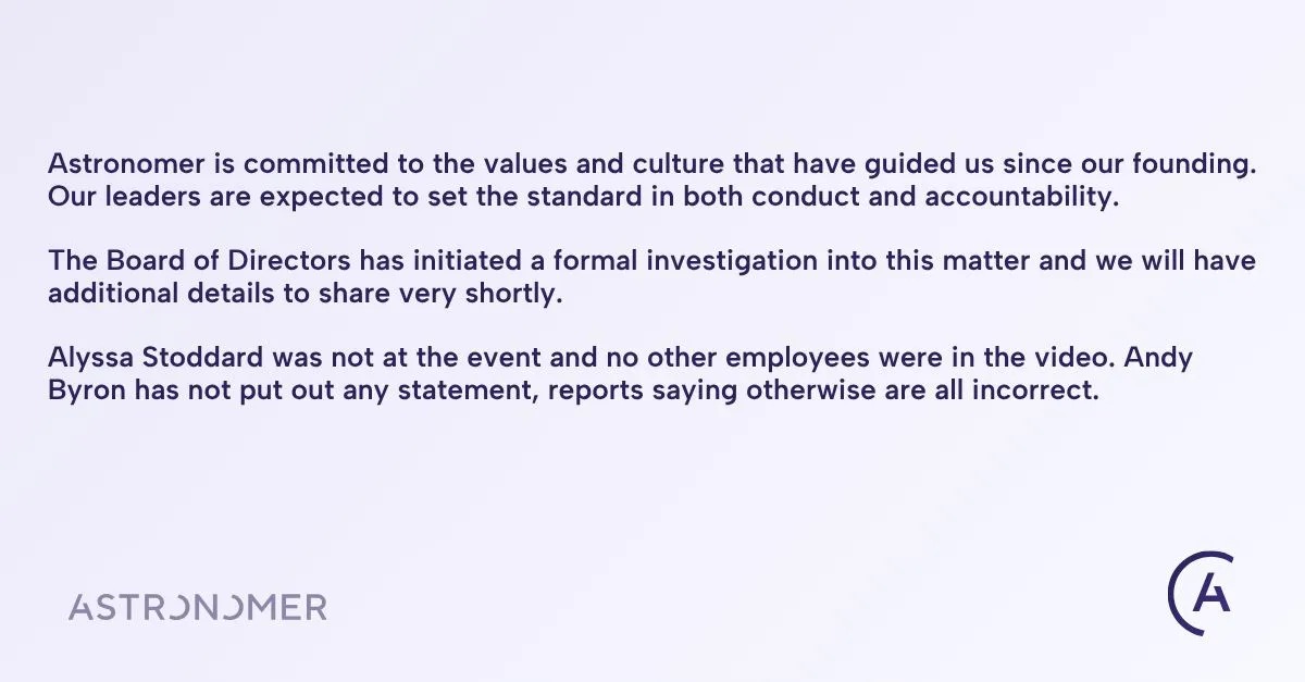 Milyar dolarlık Astronomer teknoloji şirketi CEO'su Andy Byron ve İK şefi Kristin Cabot, Coldplay konserinde öpücük kamerasına sarmaş dolaş yakalanmışlardı. Daha sonra bir açıklama yapan CEO Byron, ailesinden ve eşinden özür dilemişti.