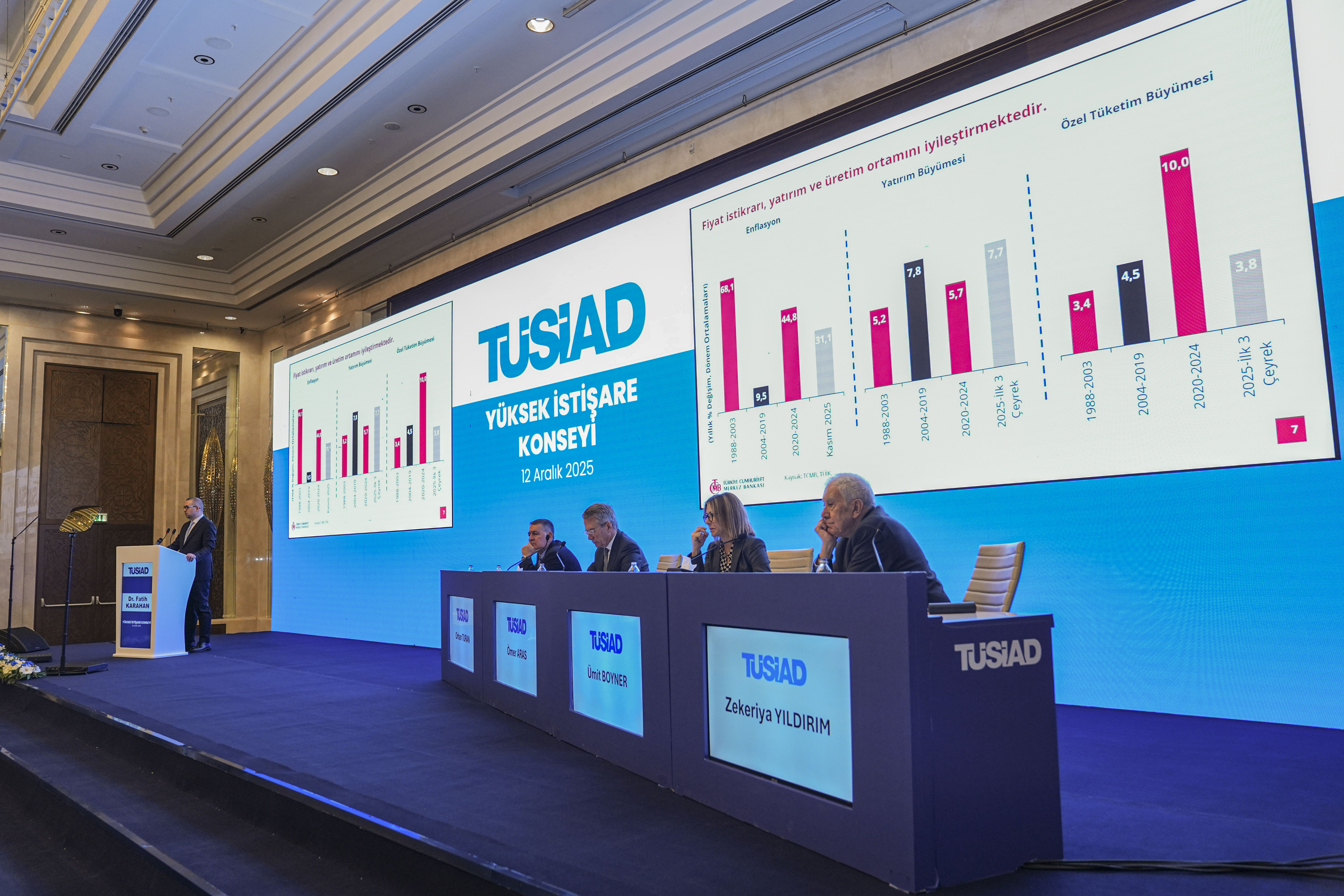 Türkiye'nin 2020'den sonra ise yeniden yüksek enflasyonla tanıştığını aktaran Karahan, "Bu 5 yıllık süreçte enflasyon, ortalama olarak yaklaşık yüzde 45 olarak gerçekleşti. Bu dönem aynı zamanda para politikasının gevşek olduğu, kredi maliyetlerinin düşük tutulduğu ve kredi miktarının da oldukça bol olduğu bir dönemdi. Yani yatırım yapmak isteyenin, finansmana ulaşmak isteyenin, ne erişim ne maliyet açısından zorlanmayacağı bir ortamdı." diye konuştu.