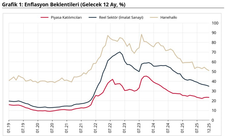 Sonuçlarda 3 grubun da enflasyon beklentilerinin gerilediği görüldü. Buna göre, 2025 yılı Aralık ayında 12 ay sonrası yıllık enflasyon beklentileri bir önceki aya göre, piyasa katılımcıları için 0,14 puan azalarak yüzde 23,35 seviyesine, reel sektör için 0,90 puan azalarak yüzde 34,80 seviyesine, hanehalkı için 1,34 puan azalarak yüzde 50,90 seviyesine geriledi.