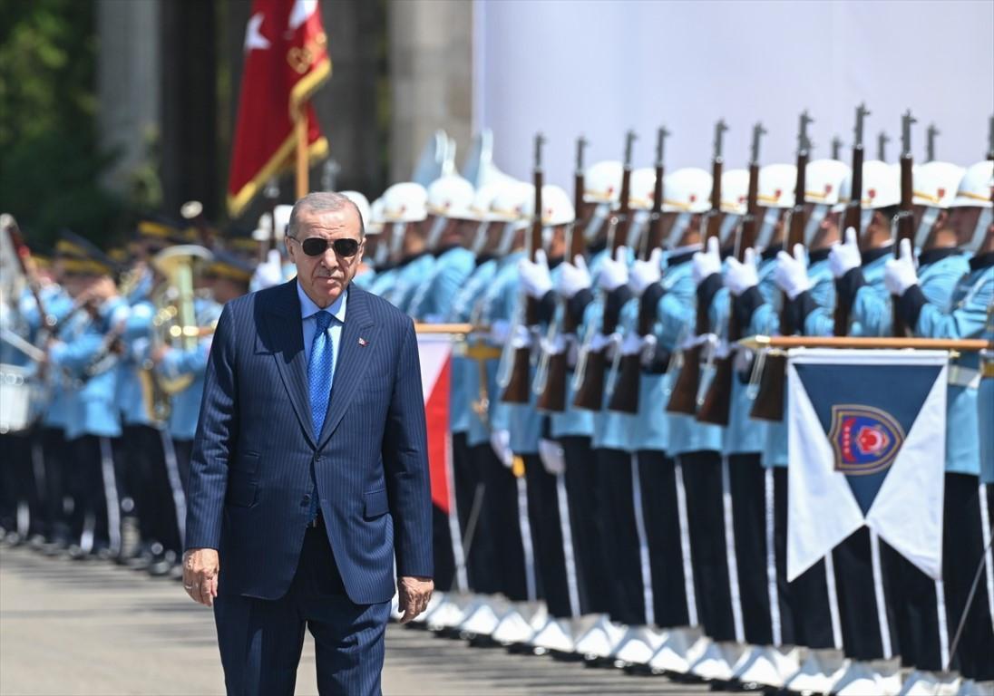 Cumhurbaşkanı Erdoğan, binaya giriş yapmadan önce tören mangasını selamladı.