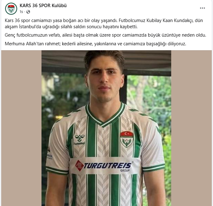 "Kars 36 spor camiamızı yasa boğan acı bir olay yaşandı. Futbolcumuz Kubilay Kaan Kundakçı, İstanbul’da uğradığı silahlı saldırı sonucu hayatını kaybetti. Genç futbolcumuzun vefatı, ailesi başta olmak üzere spor camiamızda büyük üzüntüye neden oldu. Merhuma Allah’tan rahmet; kederli ailesine, yakınlarına ve camiamıza başsağlığı diliyoruz"