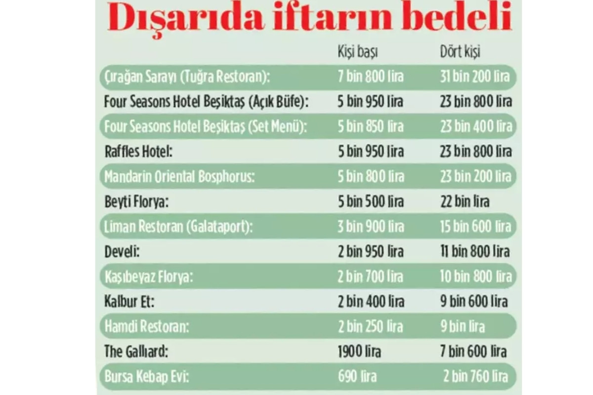 Dört kişilik bir ailenin Çırağan Sarayı’nda yapacağı iftarda 31 bin 200 lirayı gözden çıkarması gerekiyor. İstanbul Boğazı’nda yer alan Four Seasons’da ise kişi başı iftar fiyatı 5 bin 950 lira...