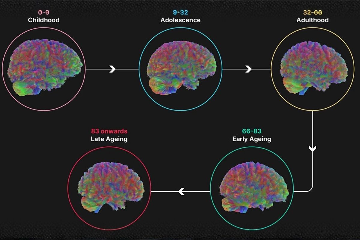 Araştırmaya göre beyin gelişimi, 9, 32, 66 ve 83 yaşlarında olmak üzere dört kritik dönüm noktasıyla birbirinden ayrılan 5 geniş dönemde gerçekleşiyor.