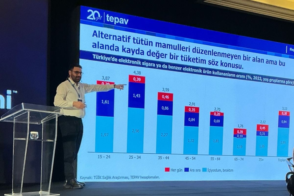TEPAV Kalkınma Programı Direktörü H. Ekrem Cunedioğlu, Türkiye’de tütün kullanımıyla ilgili verileri açıkladı. Tütün kullanımının 15 yaş üstü nüfusta yüzde 30’lar seviyesinde olduğunu anlatan Cunedioğlu, “Küresel ortalama yüzde 22.7 seviyesinde. Türkiye 165 ülke arasında en çok tütün kullanan 27’nci ülke” dedi.