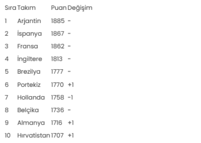 Arjantin'in zirvede bulunmaya devam ettiği sıralamanın ilk 5 basamağında bir değişiklik olmazken, ilk 10'da ise Portekiz bir basamak yükselerek 6. sıraya çıktı, Hollanda ise bir basamak düşerek 7. sıraya geriledi. Almanya 10. sıradan 9. sıraya yükselirken, Hırvatistan da bir basamak yükselerek 10. sırada yer aldı. Daha önce ilk 10'da bulunan İtalya ise 12. sıraya geriledi.